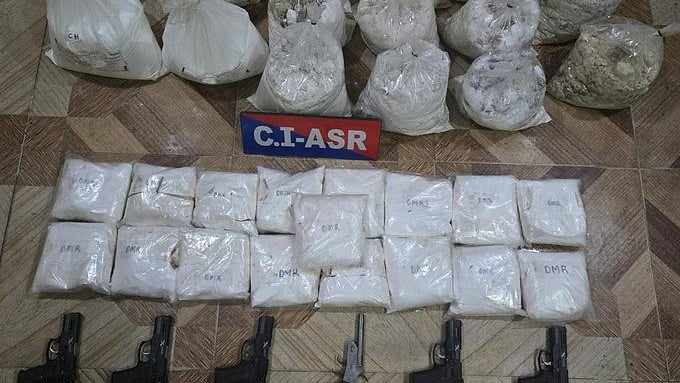 - 105 किलोग्राम हेरोइन और छह आग्नेयास्त्रों के साथ-साथ कैफीन और डेक्सट्रोमेथॉरफन के एजेंट भी जब्त किए गए